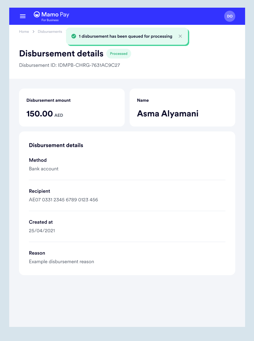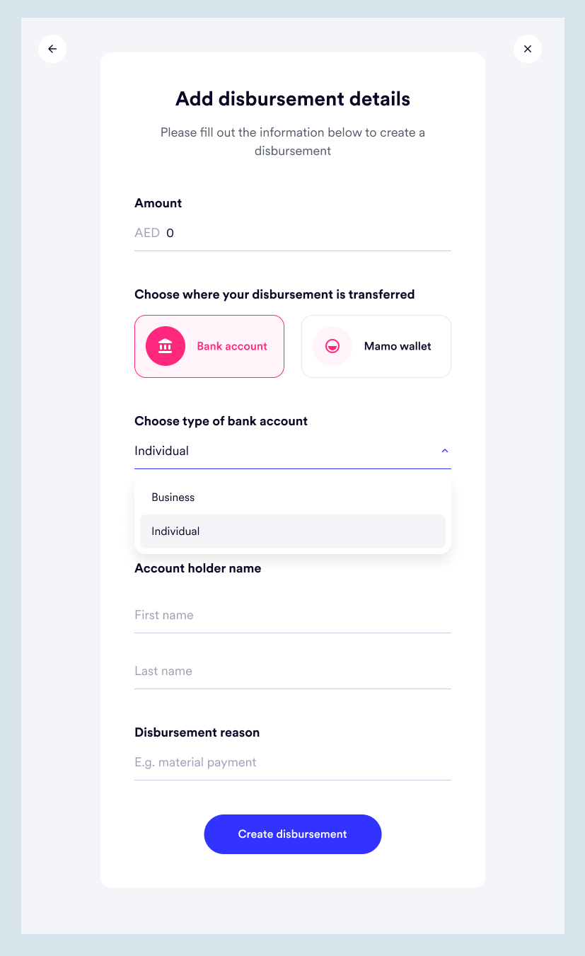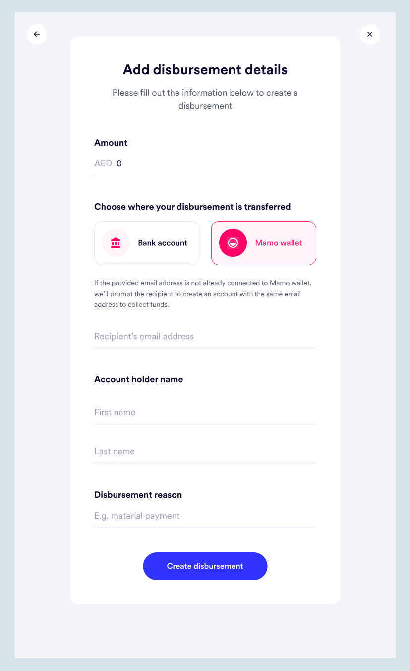 For disbursements to a bank account, IBAN is required and for Mamo account user, email address is what's needed.
