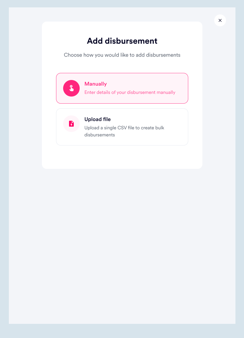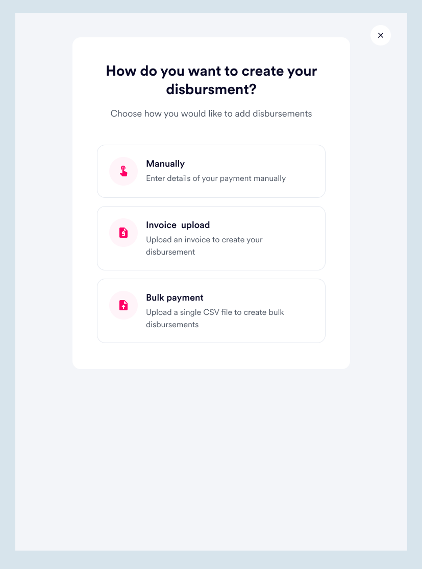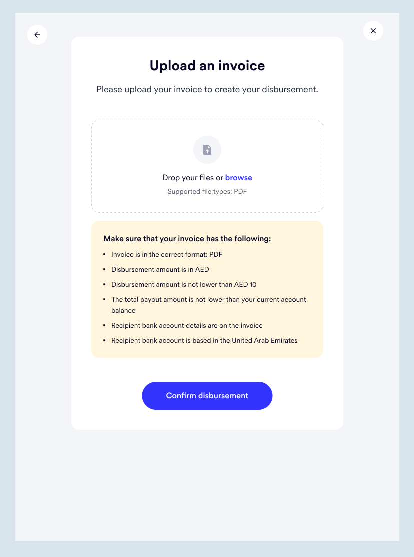 This works very similarly to the first type of disbursement, where a CSV file is uploaded to make bulk payments. However, an invoice is uploaded to process a single payment in this case.