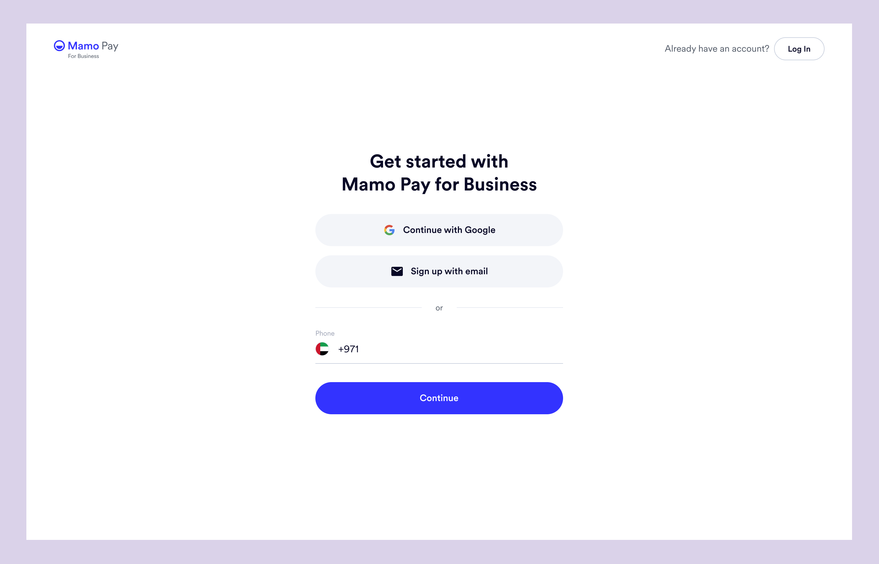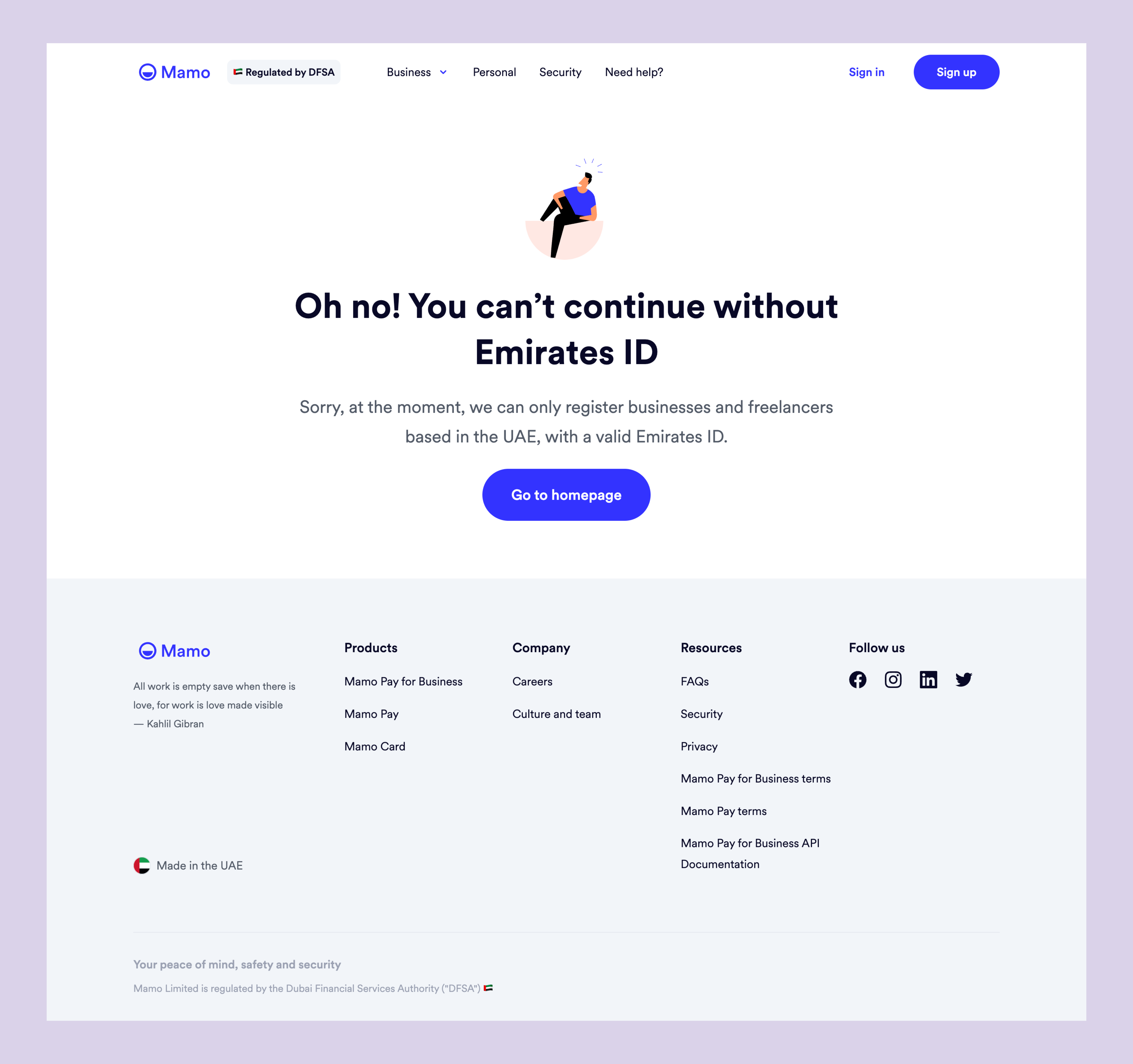 At the time of this project, Mamo operated only in the UAE. While businesses could receive international payments, the business owner is still required to be a legal resident of the UAE, therefore from the first page, if the user does not have an Emirates ID, the first screen below shows up.