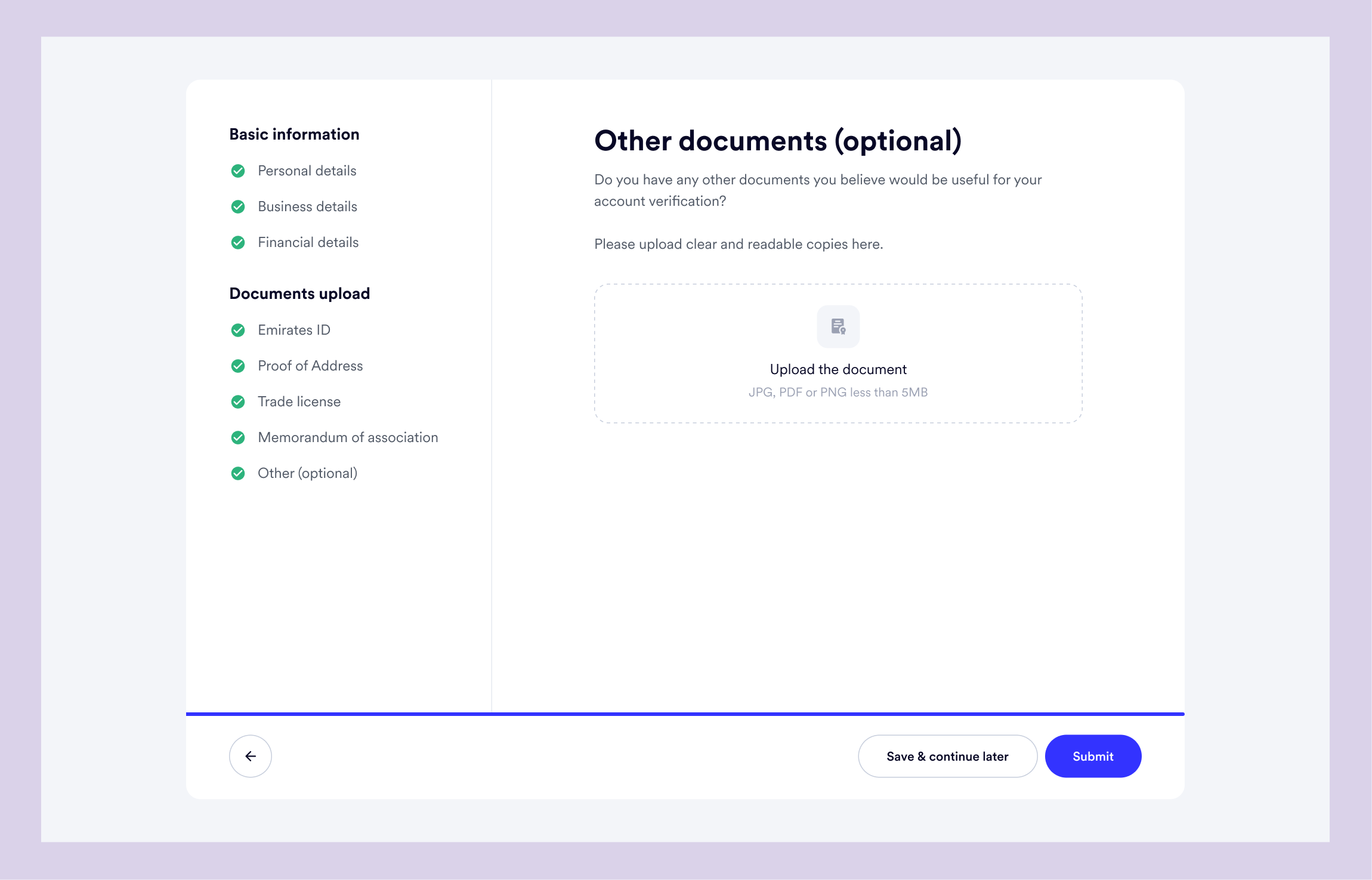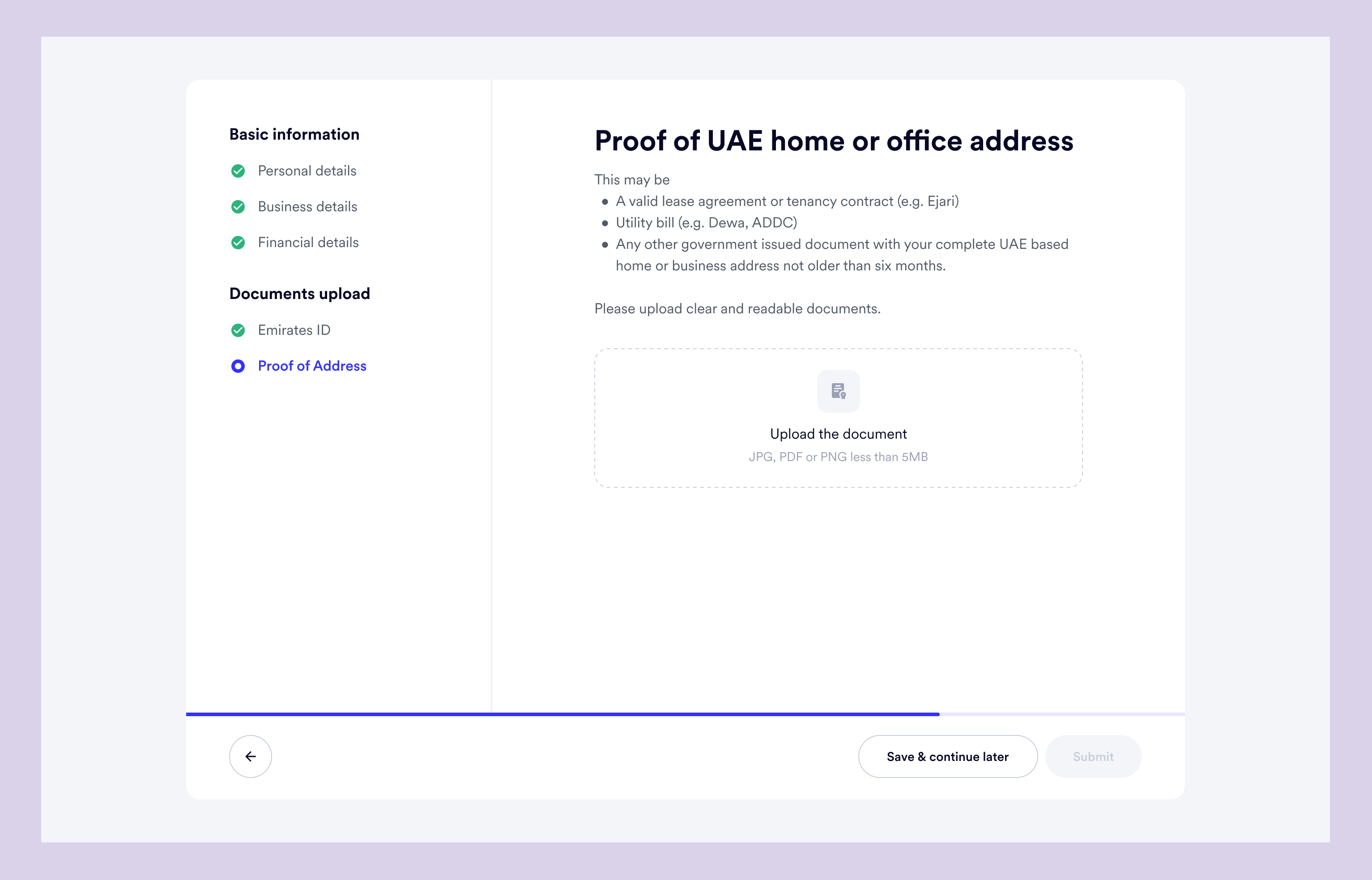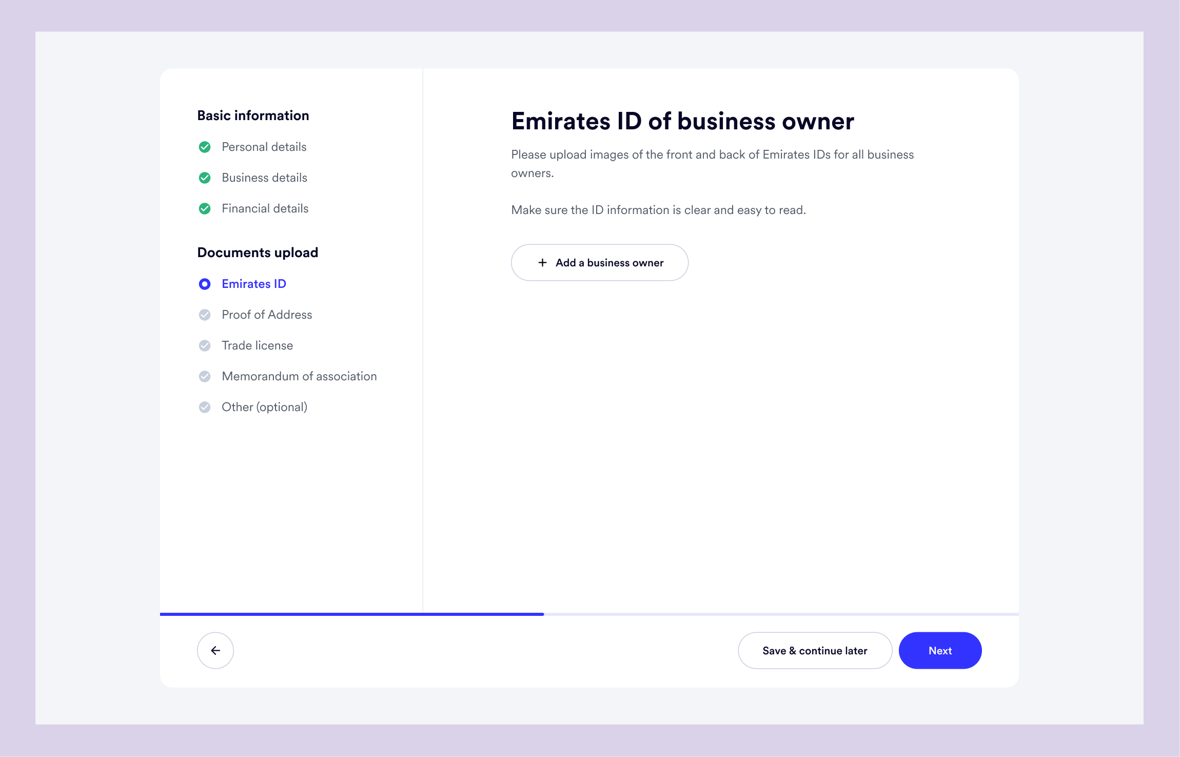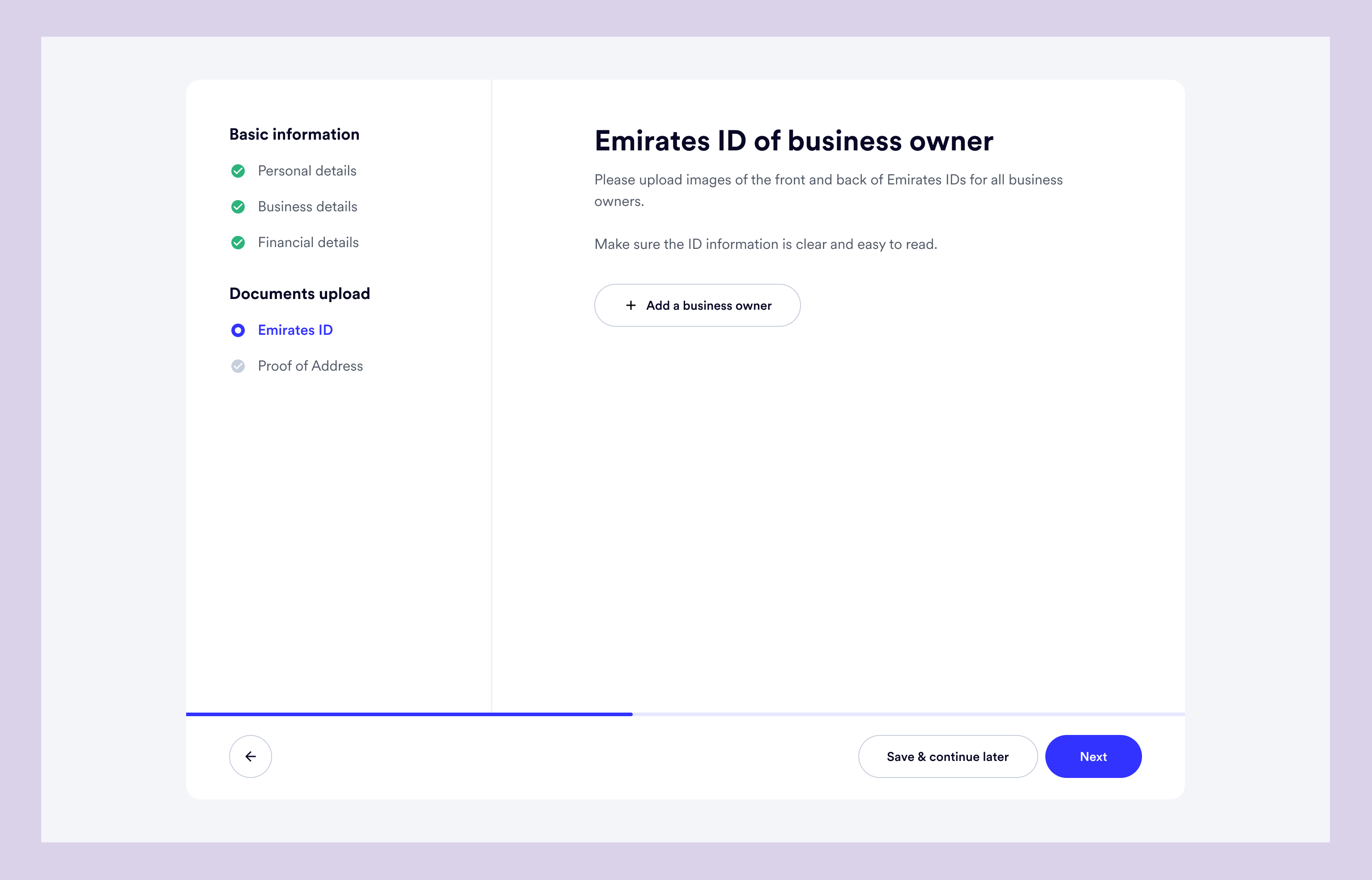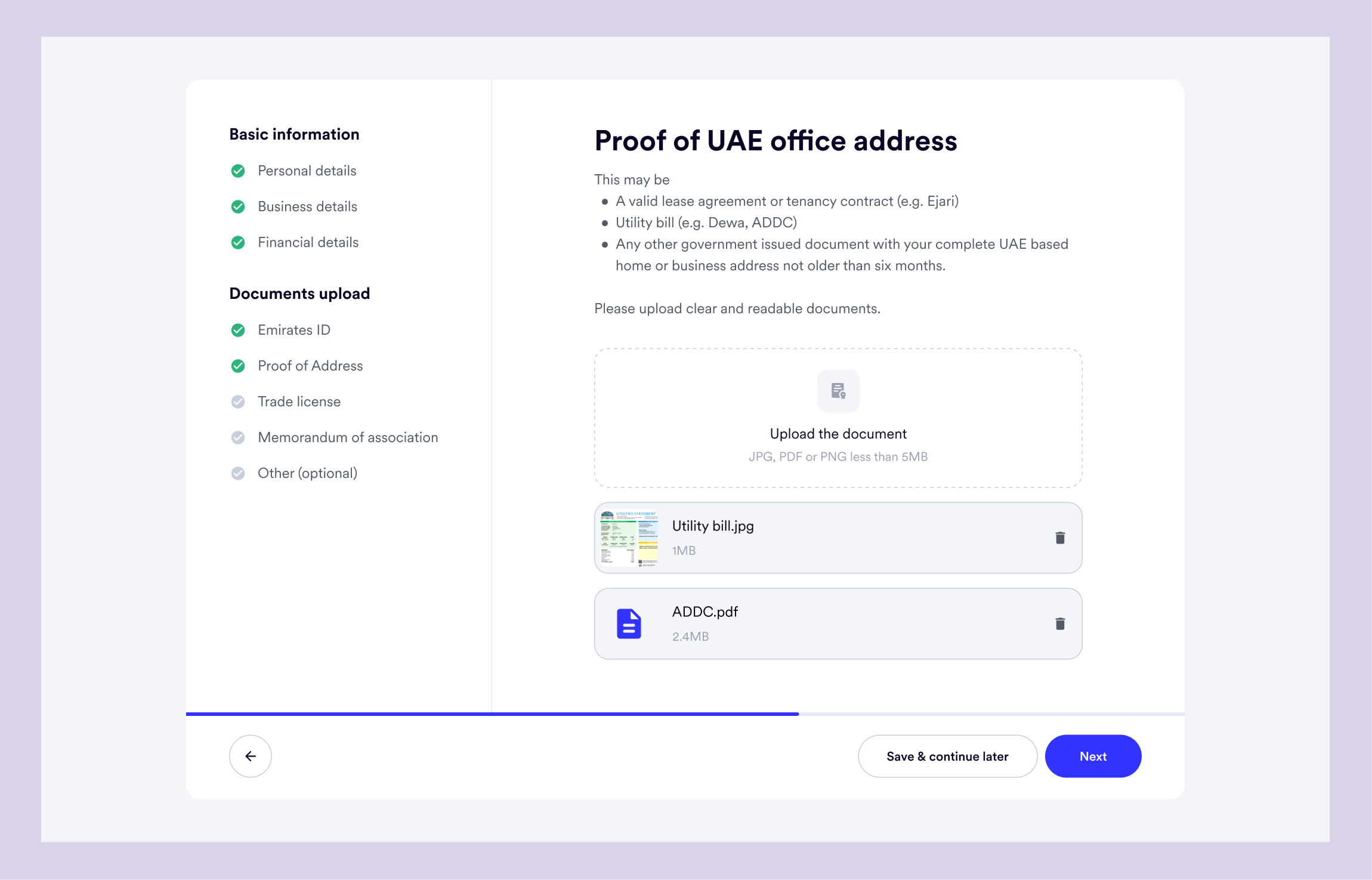 We require proof of address and Emirates ID for registered businesses and freelancers, so these documents will be included in the default verification journey. However, if the user selects "registered business" at the point of choosing the type of business, the other required documents will be added to the list.
