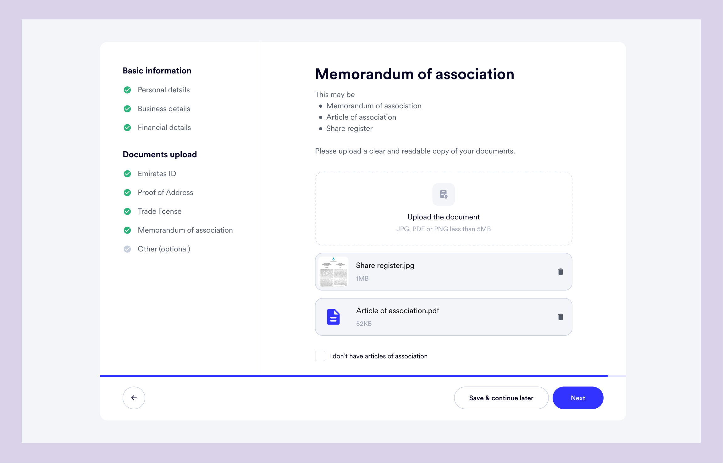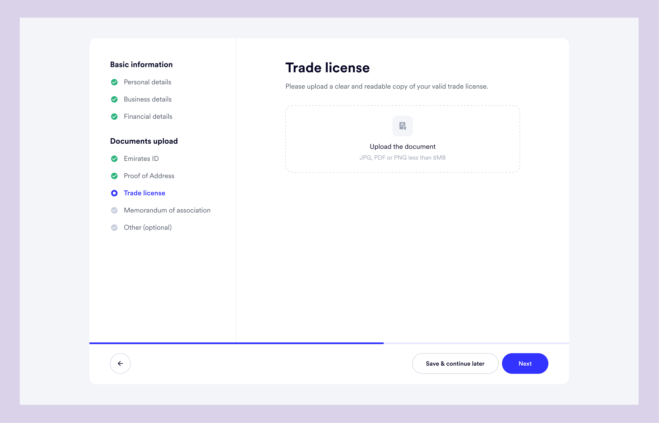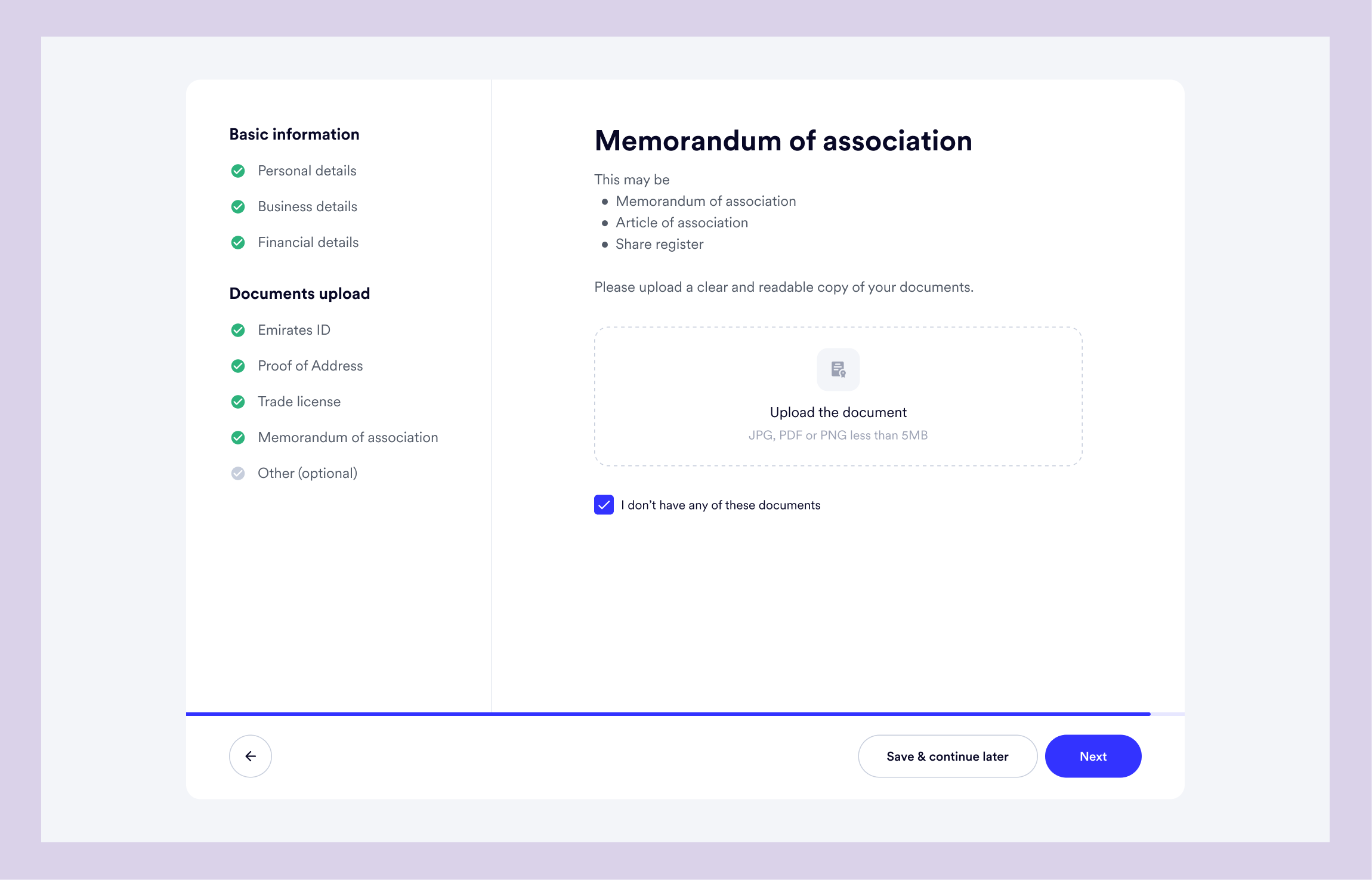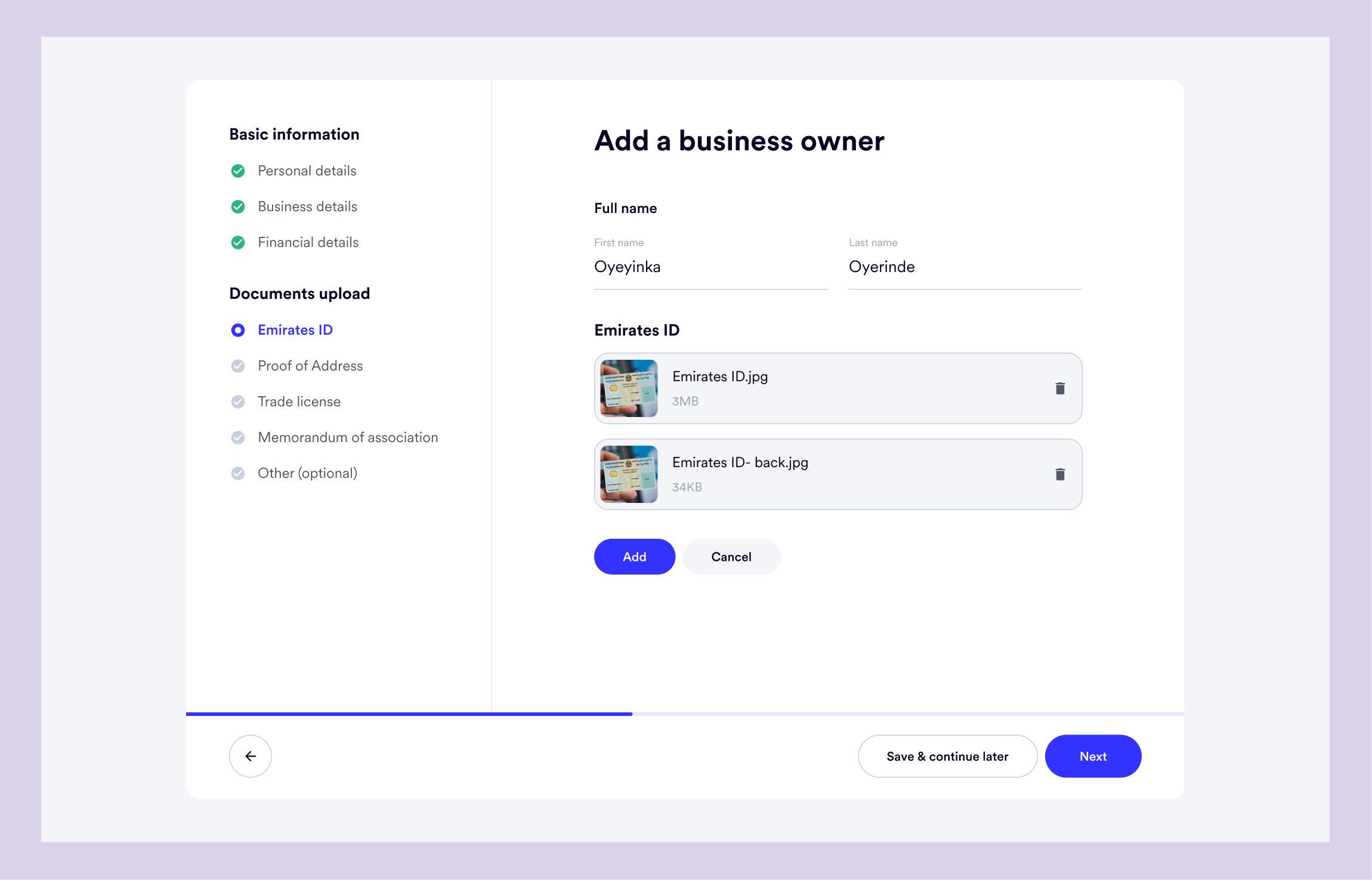 We require proof of address and Emirates ID for registered businesses and freelancers, so these documents will be included in the default verification journey. However, if the user selects "registered business" at the point of choosing the type of business, the other required documents will be added to the list.