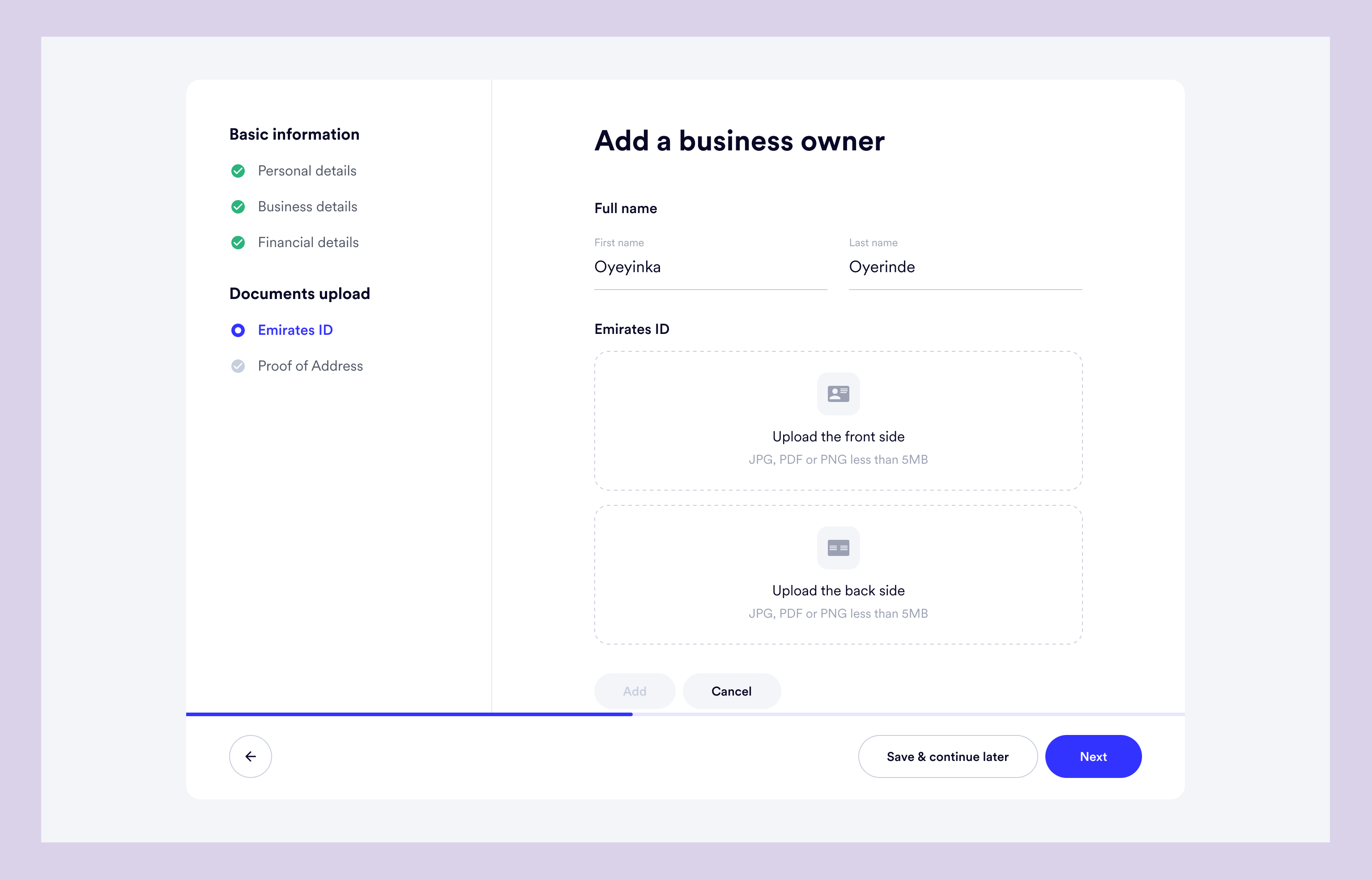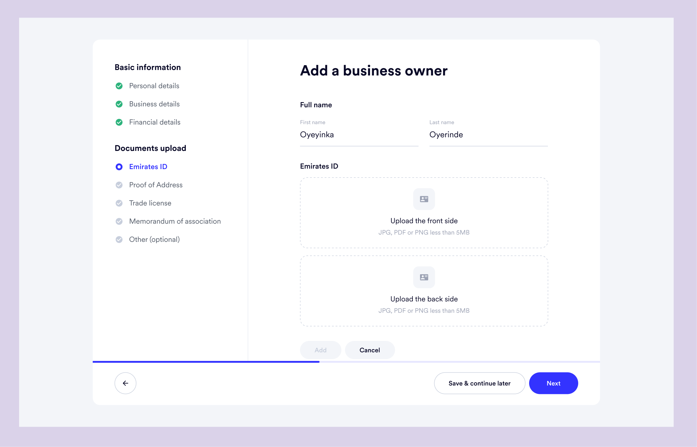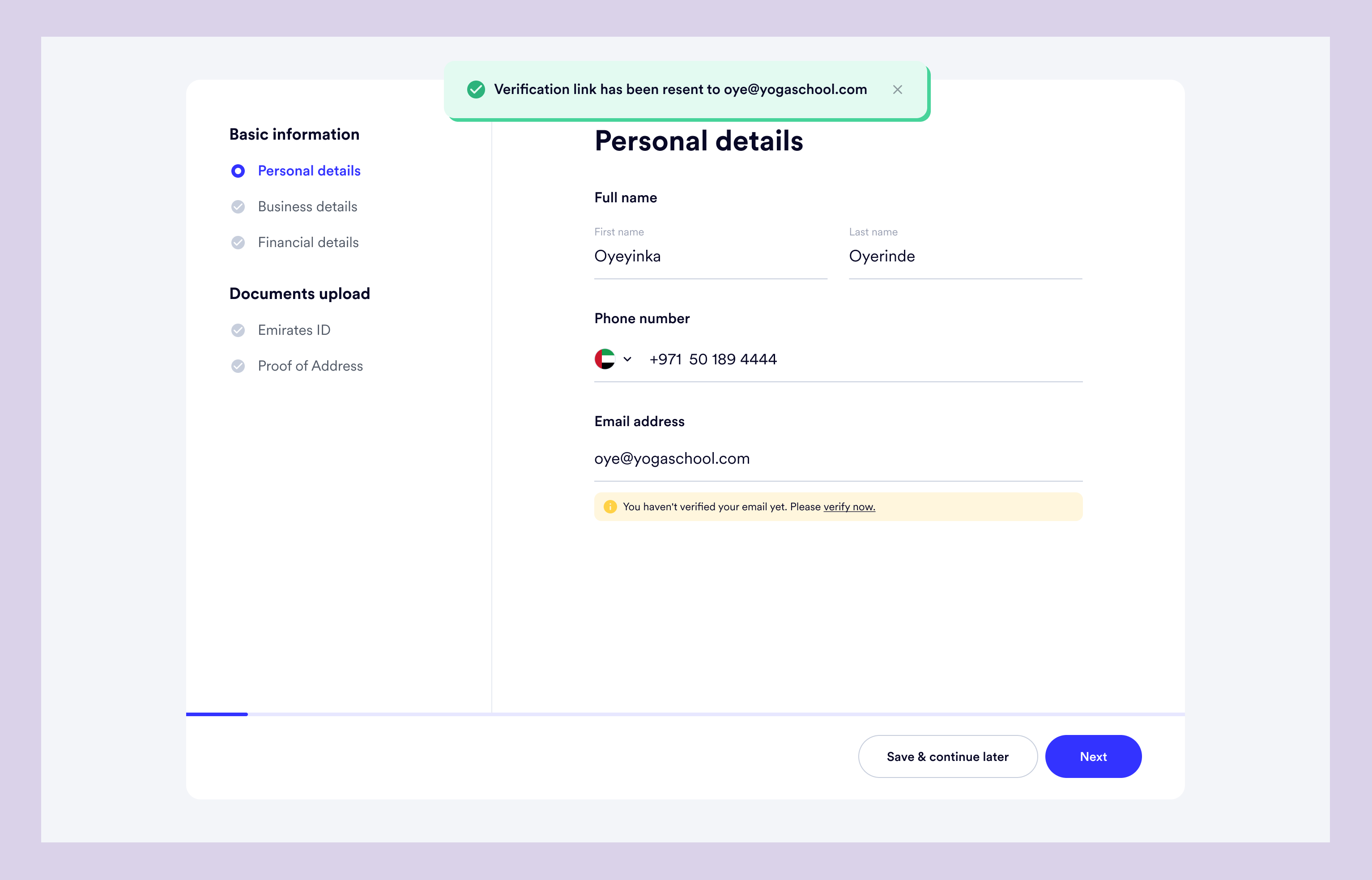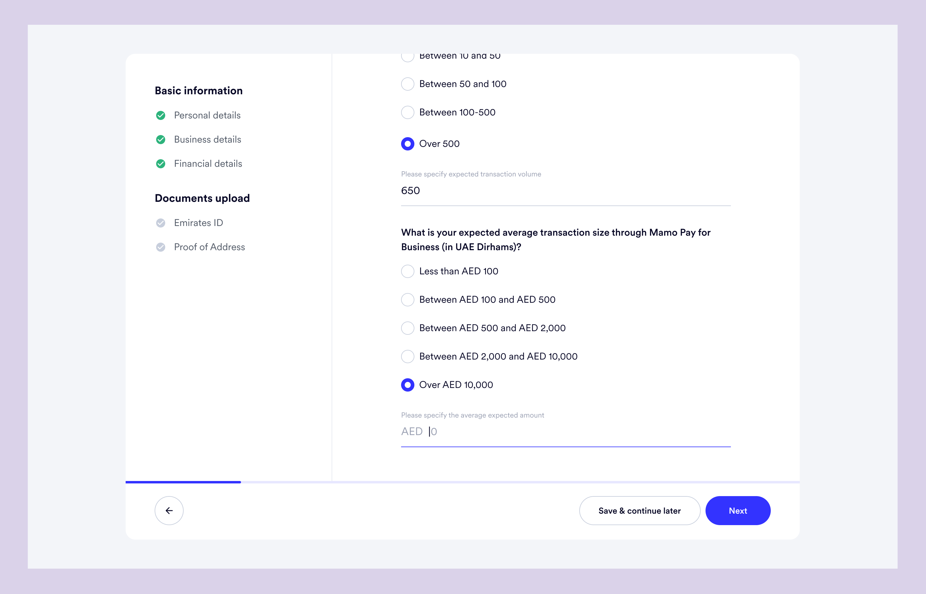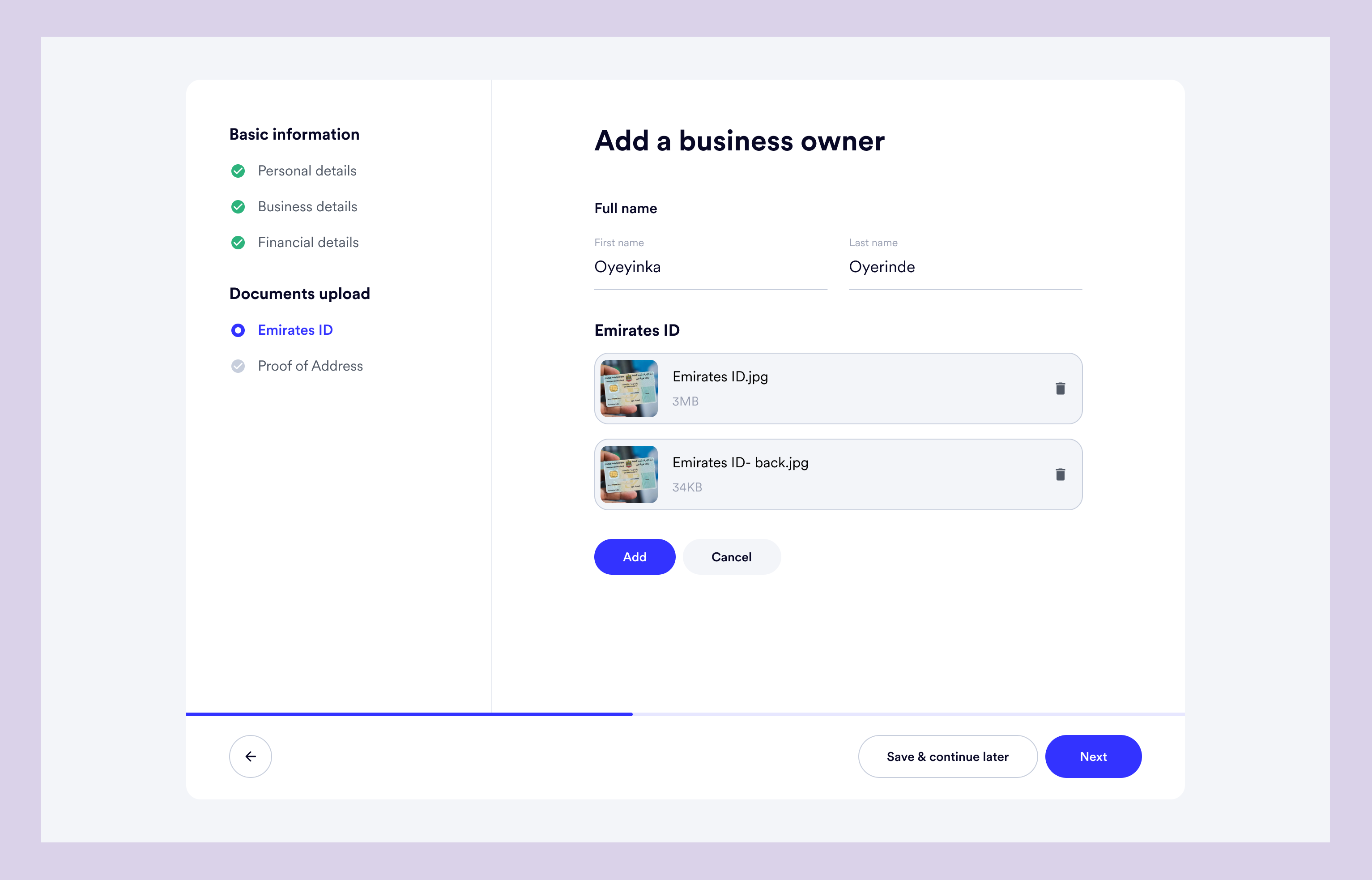 We require proof of address and Emirates ID for registered businesses and freelancers, so these documents will be included in the default verification journey. However, if the user selects "registered business" at the point of choosing the type of business, the other required documents will be added to the list.