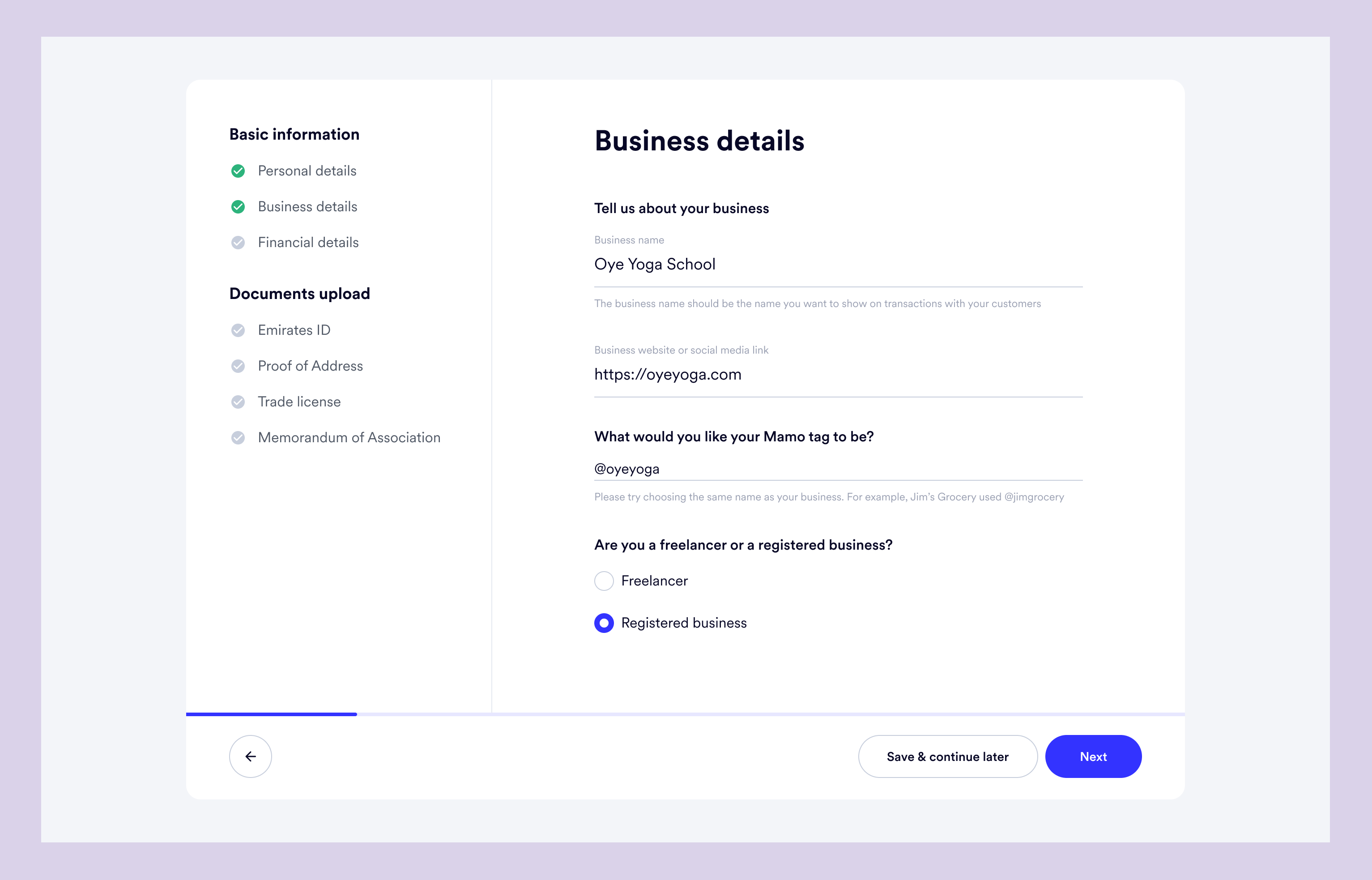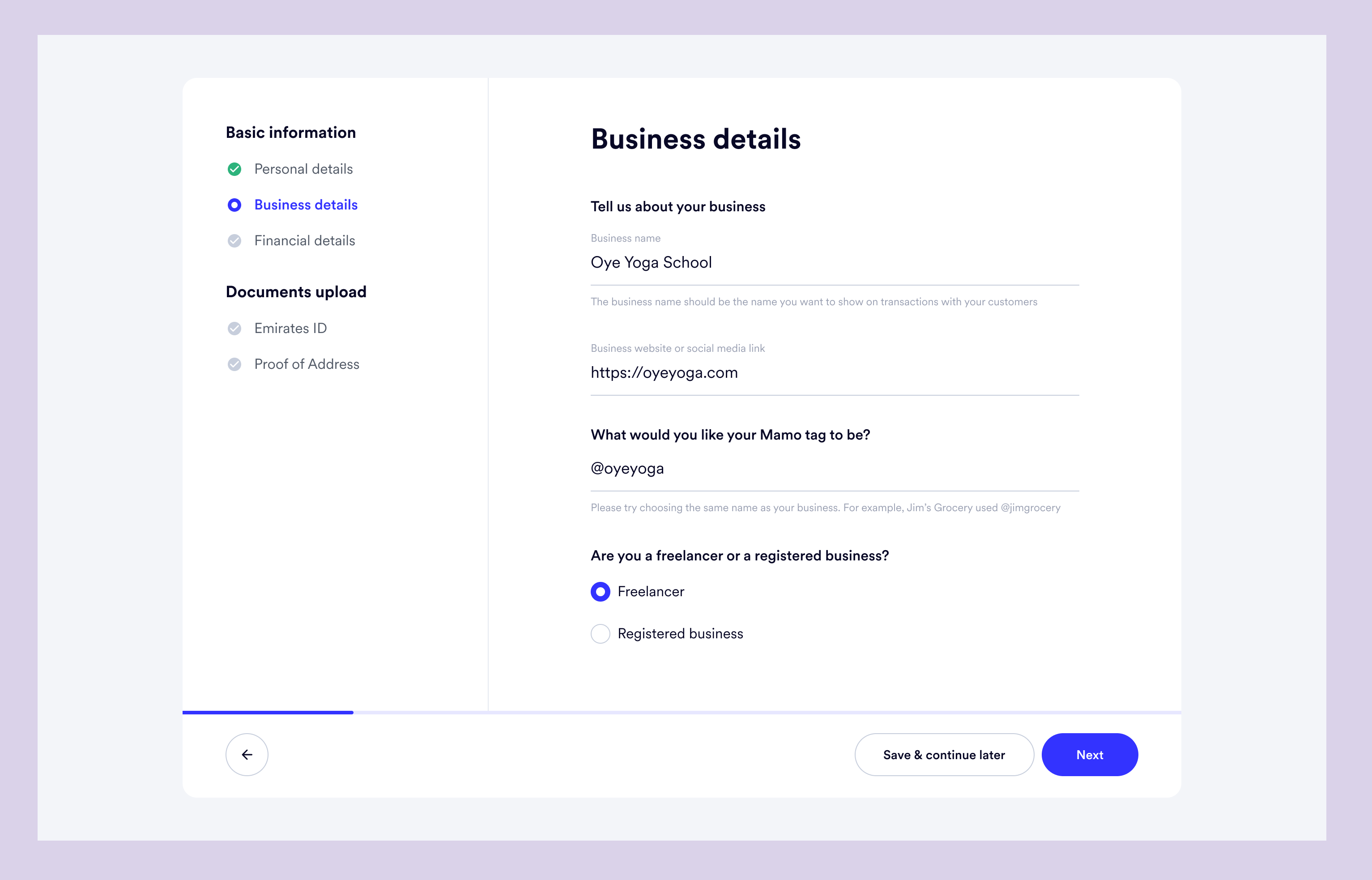 Mamo caters to both freelancers and registered businesses, but to verify them, there are different documents required. So it was important to know which type of business the user runs in the verification journey.