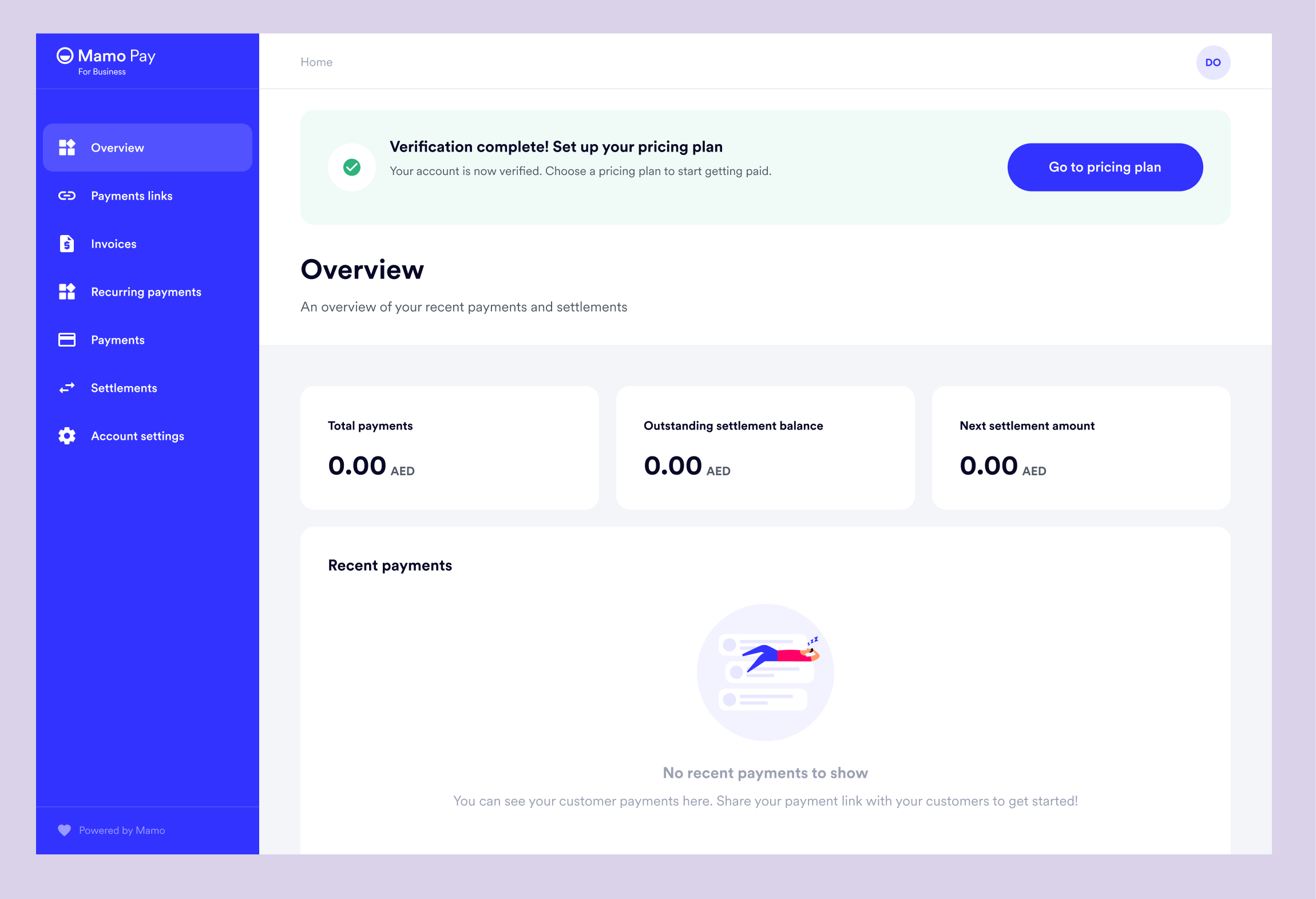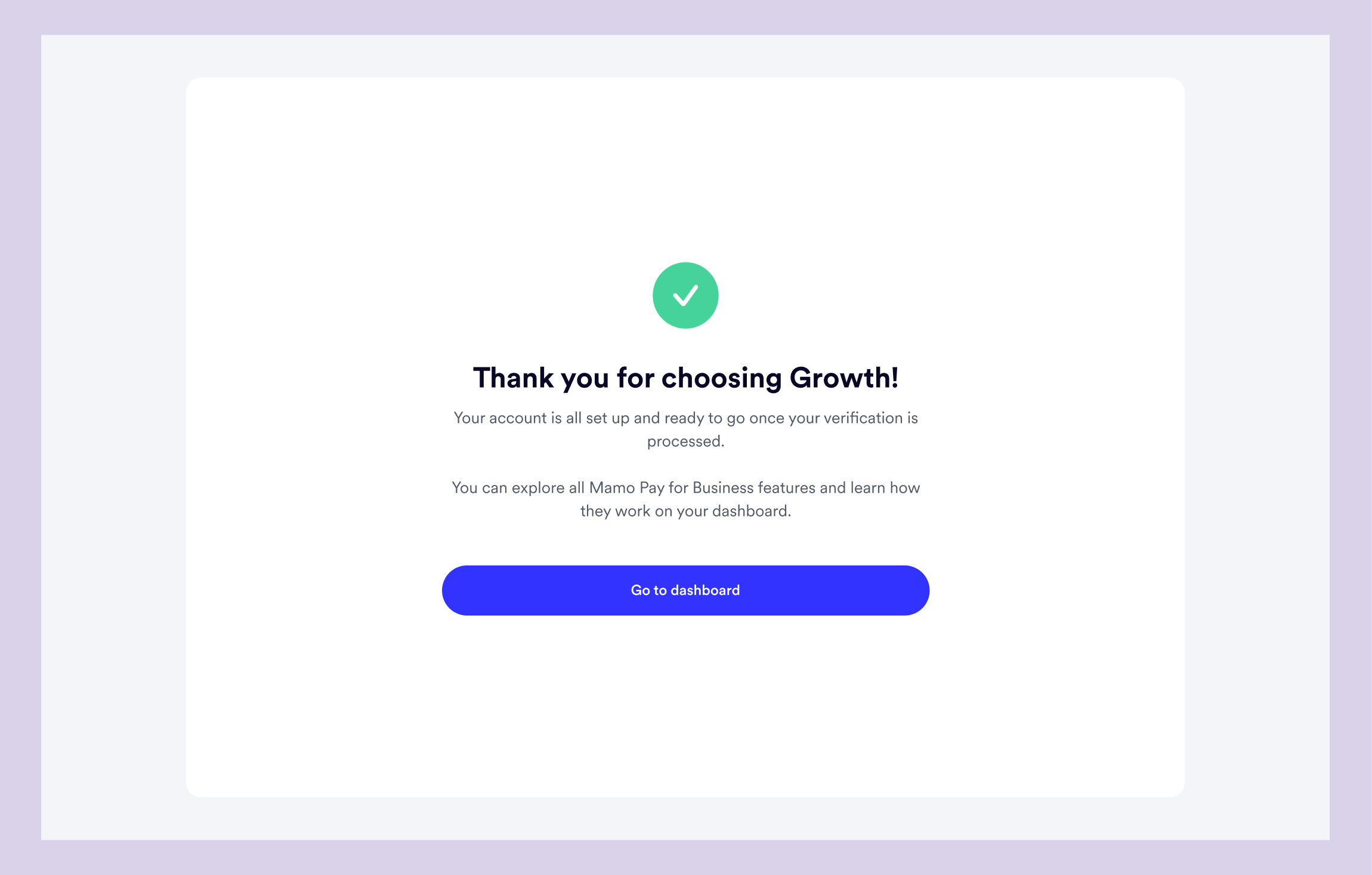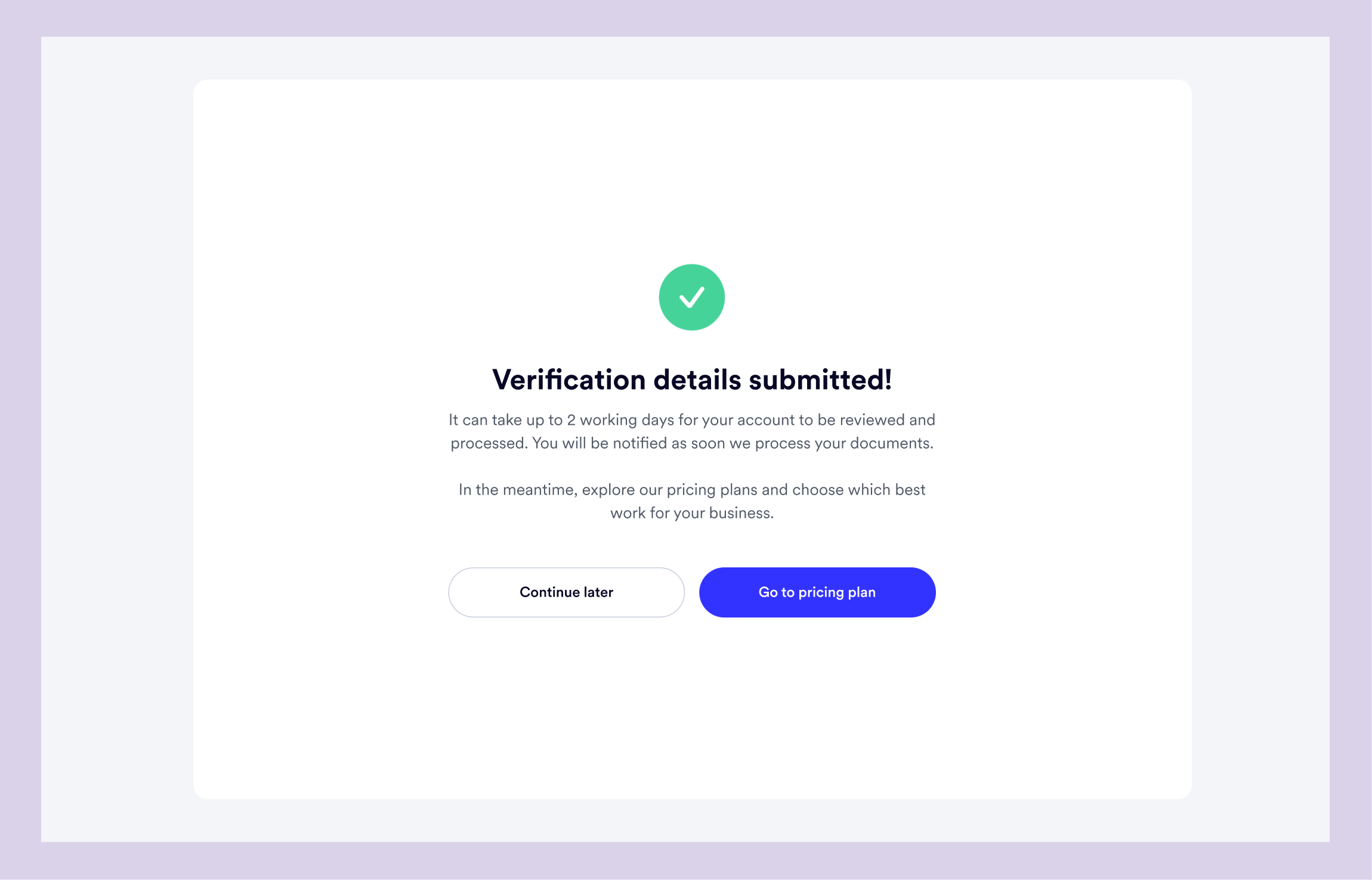 Before an account can be used to generate payments, it is important to understand which of our pricing plans the user prefers and the settlement period for which received payments will be settled to their account, as this influences the pricing. While awaiting the verification verdict, the user will be encouraged to set up their pricing plan, so that when their account is verified, they can start receiving payments without any delays.