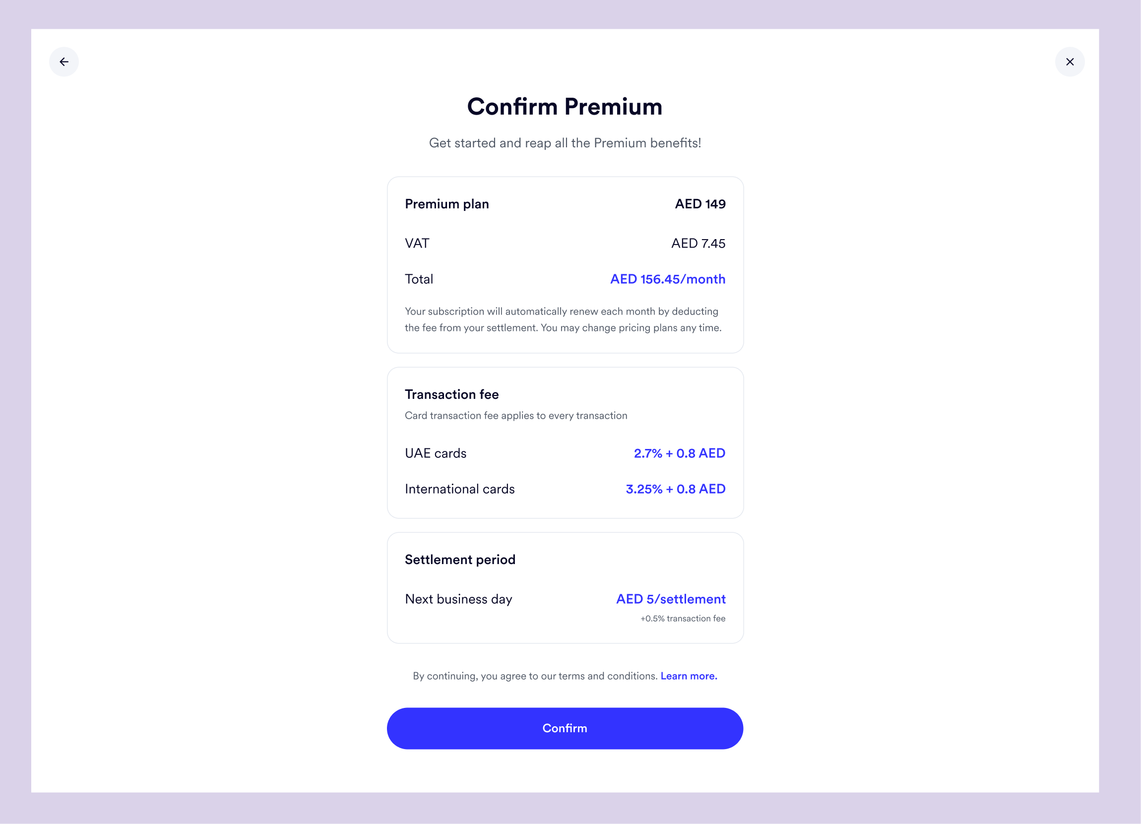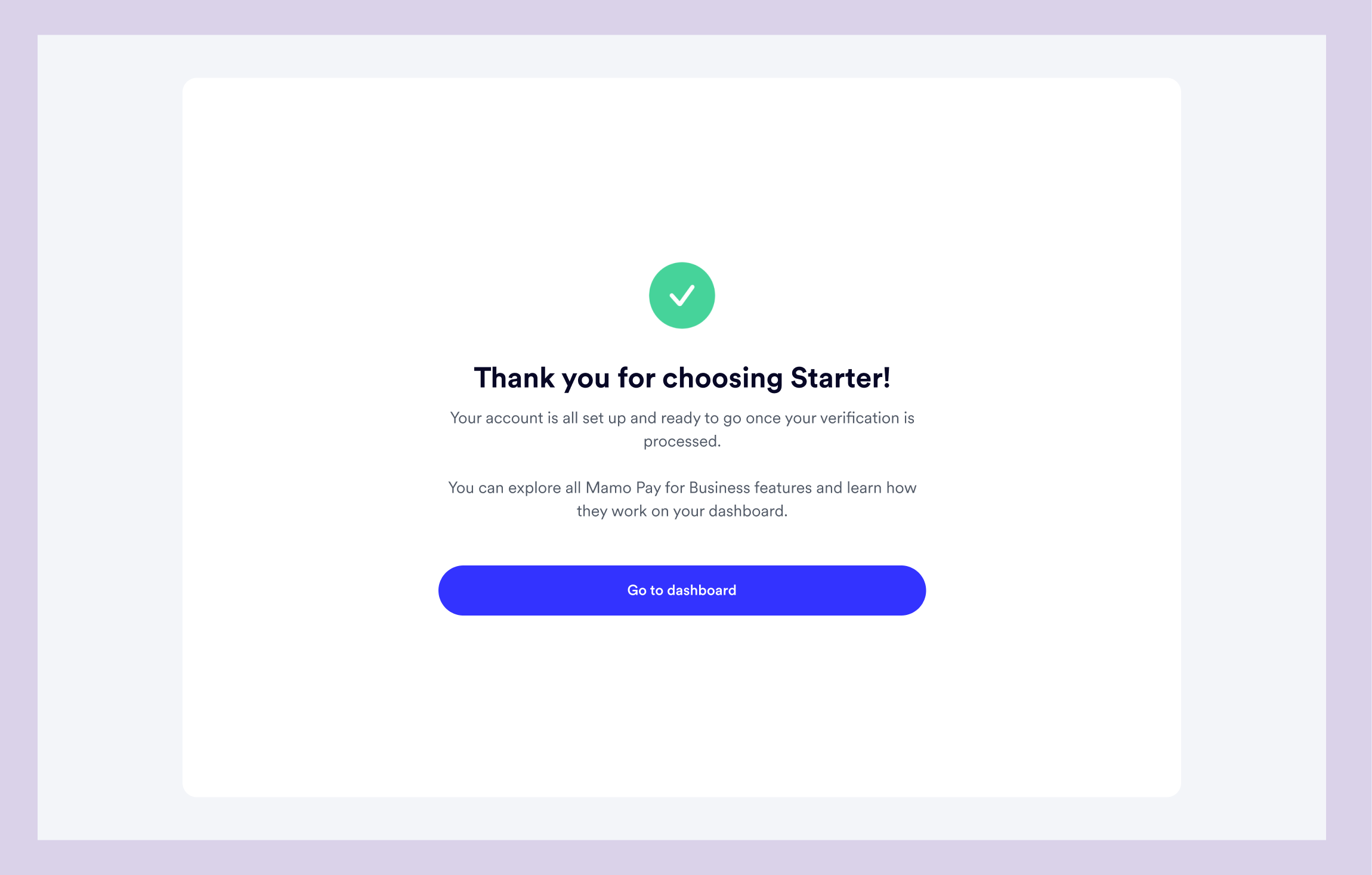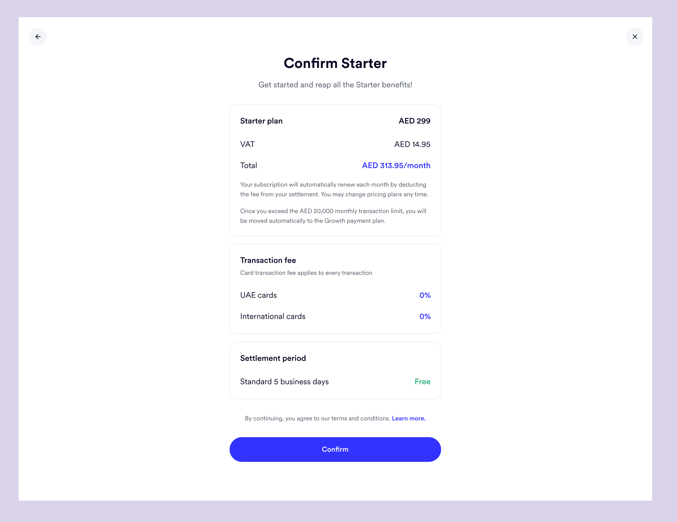 The Starter plan has no transaction fee and has a fixed settlement period. So for that, we have just the confirmation page.