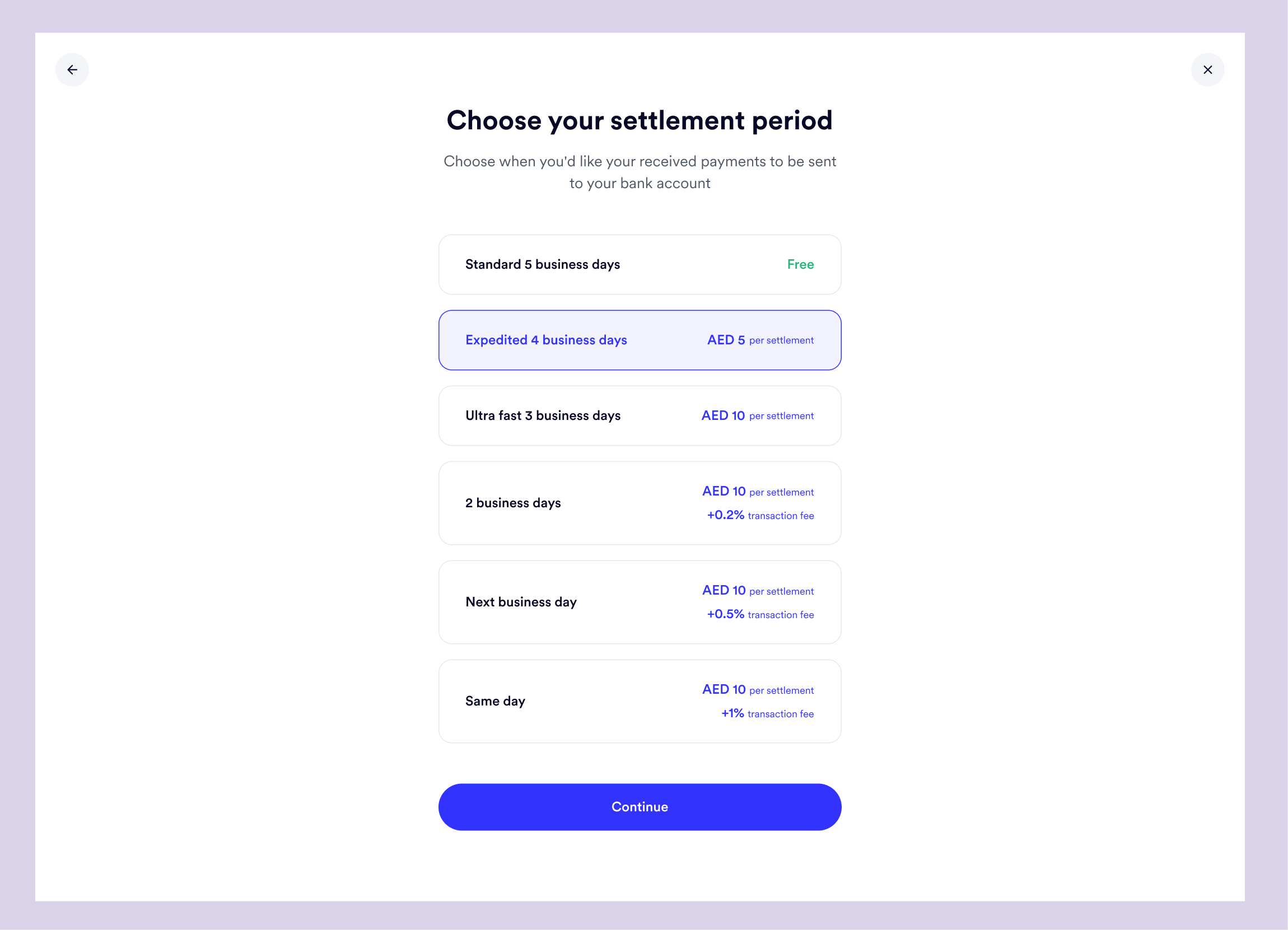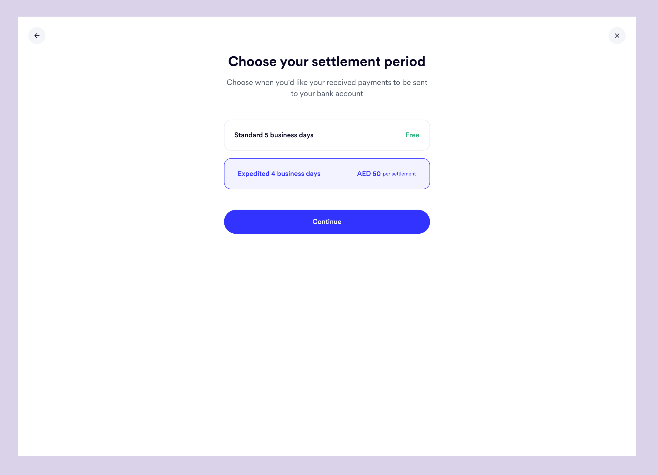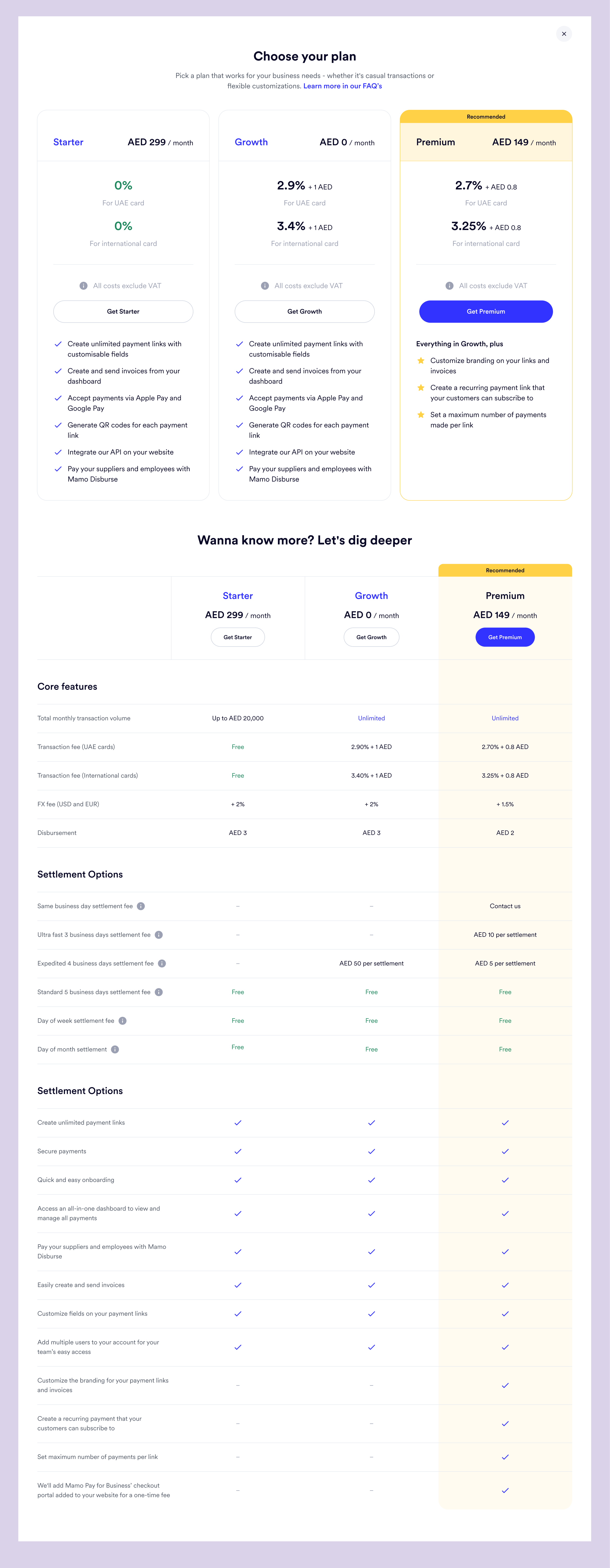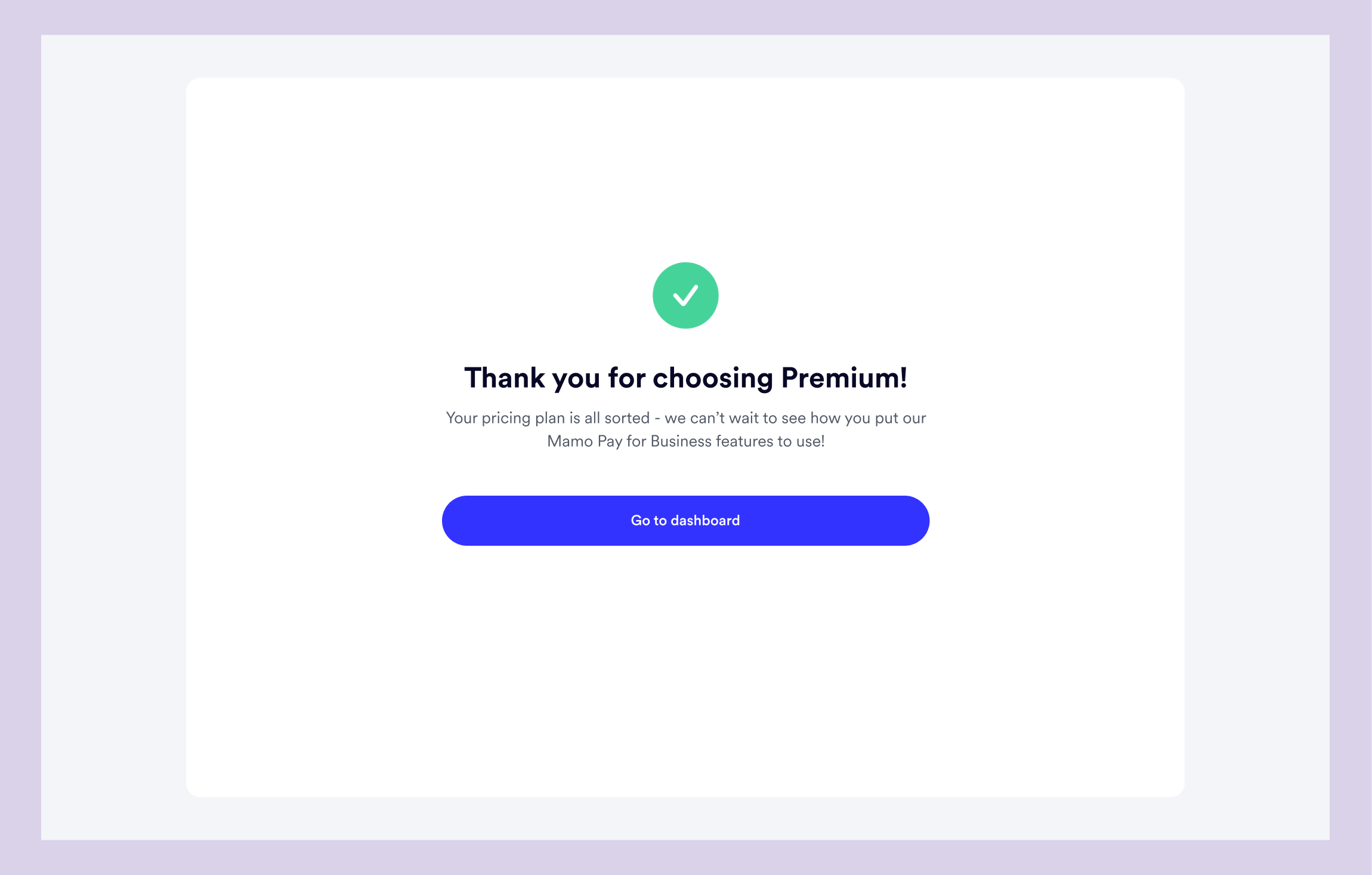 The Starter plan has no transaction fee and has a fixed settlement period. So for that, we have just the confirmation page.